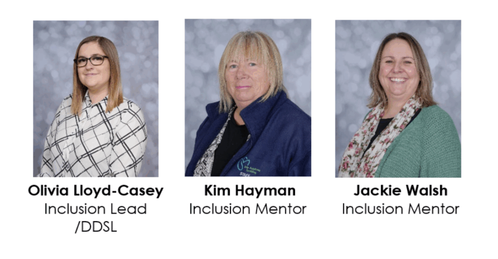 | Olivia Lloyd-Casey – Inclusion Lead (Deputy Designated Safeguarding Lead) Will Munton – Behaviour Lead Jackie Walsh – Inclusion Mentor Kim Hayman – Inclusion Mentor Katie Grimston – Cover Supervisor Sam Palmer – Learning In The Natural Environment Lead Karen Kitney – Portage Worker Sam Pittock – Specialist Teacher (Working Together Team) |